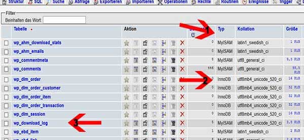 2. Jetzt kannst du sehen, welche Engine Typen deine Verzeichnisse verwenden. In dem folgenden Bild unten erkennst du, dass unterschiedliche Storage-Engines verwendet werden (sowohl MyISAM als auch InnoDB).