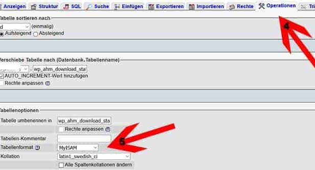 5. Klicke im Bereich „Tabellenoptionen“ in der Spalte „Tabellenformat“ auf das Auswahlfeld und ändere die Engine von MyISAM zu InnoDB. Anschließend die Änderung mit „ok“ bestätigen.