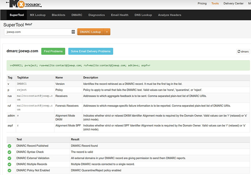Hier haben wir drei Tags: v, p und rua mit den Werten DMARC1, reject und mailto: contact@joewp.com.