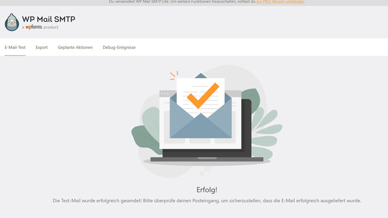 Anschließend kannst du im Dashboard von WordPress noch unter „WP Mail SMTP“ (WP Forms) prüfen, ob die Einstellungen richtig sind und der Versand der Mails einwandfrei funktioniert. Schicke dir einfach eine Test-Mail an eine deiner Mail-Adressen. Wenn alles richtig läuft, dann bekommst du die Meldung „Erfolg! Die Test-Mail wurde erfolgreich gesendet! Bitte überprüfe deinen Posteingang, um sicherzustellen, dass die E-Mail erfolgreich ausgeliefert wurde.“ wie in nachstehendem Screenshot angezeigt.