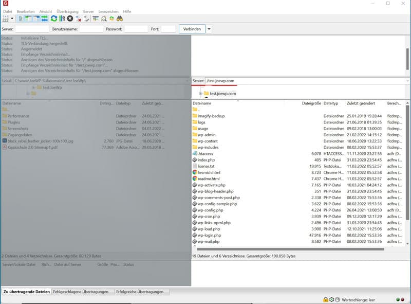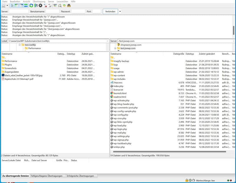 Der Ordner „wp-content“ enthält Unterordner für deine Themes und Plugins. Per Klick auf diesen Ordner öffnen sich die Unterordner. Hier kannst du entsprechende Änderungen vornehmen. Du kannst aber auch per Drag & Drop vom rechten Server-Bereich Ordner oder Dateien in den linken Bereich auf deinen Rechner herunterladen. Du kannst so auch eine vollständige Sicherung der Website vornehmen. Beachte aber, dass dies kein vollständiges Backup deiner WordPress-Site ist. Alle deine Inhalte werden in einer Datenbank gespeichert. Für eine vollständige Sicherung muss dann diese DB auch noch gesichert werden.